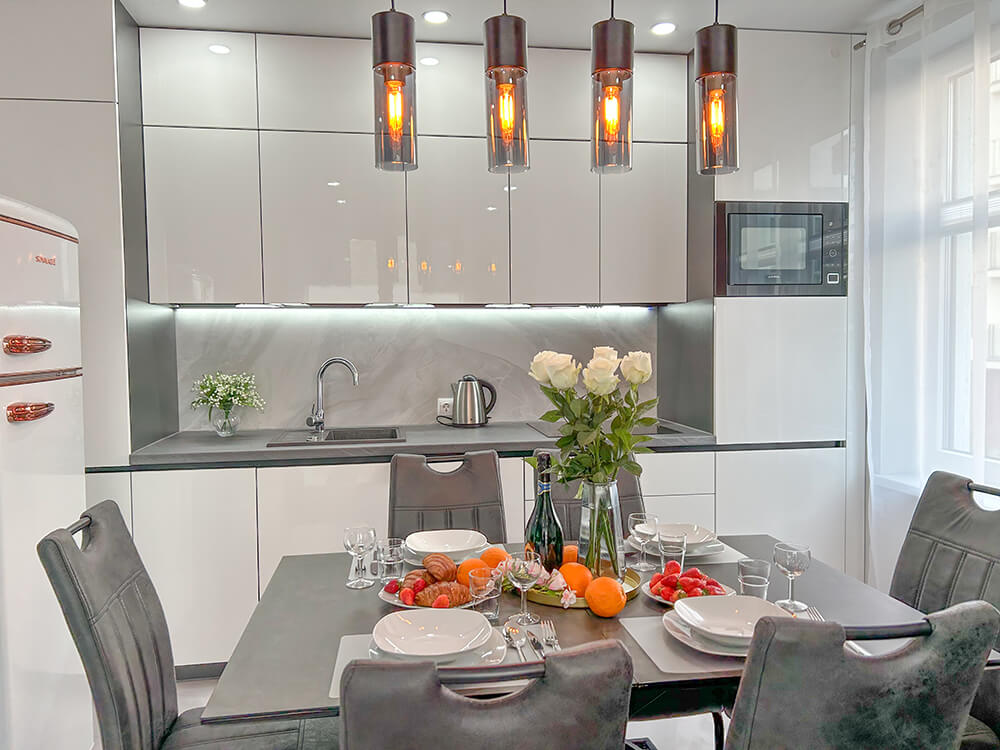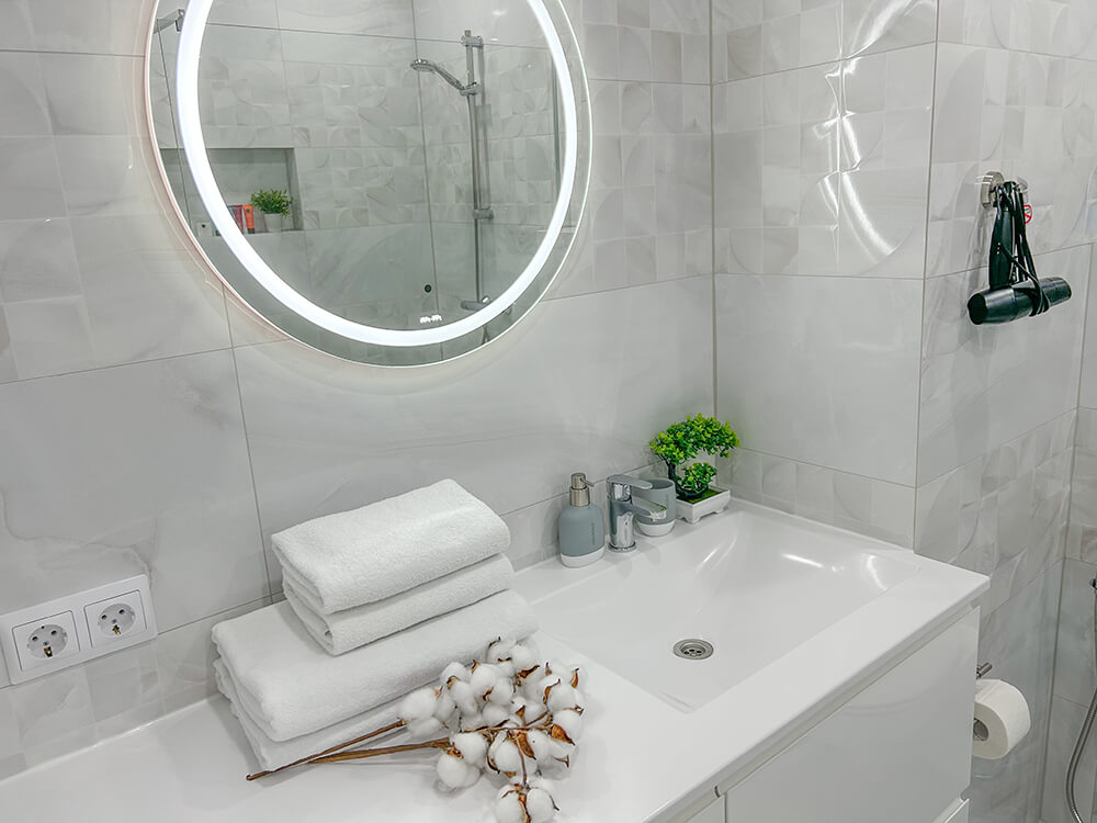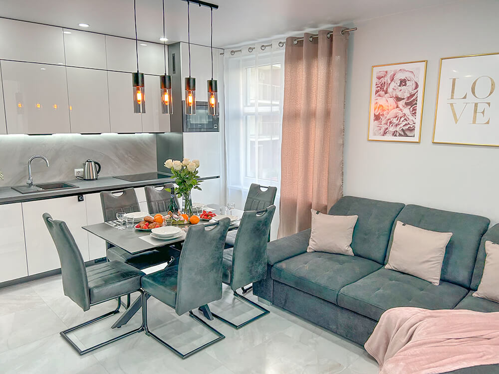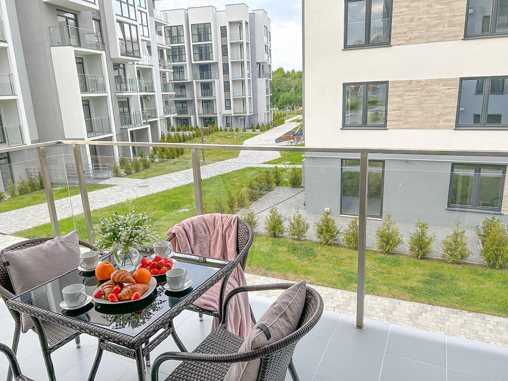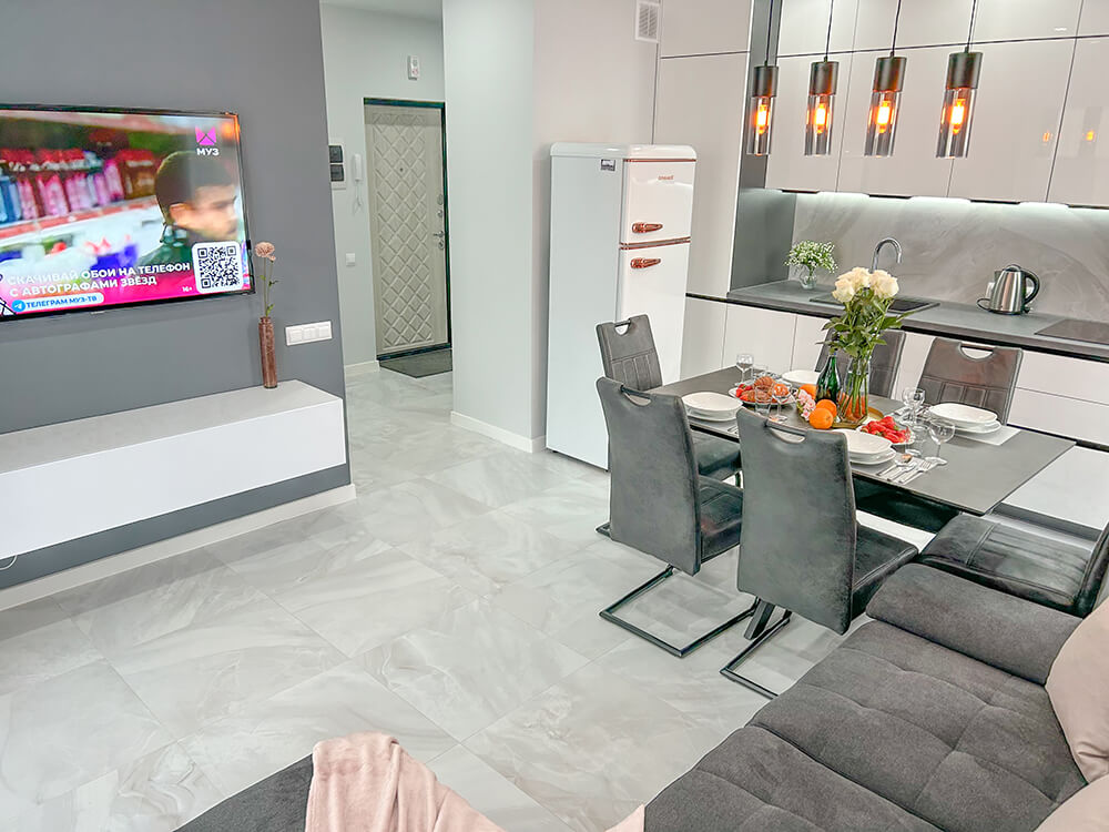 - Оборудование: гладильная доска, духовой шкаф, кондиционер, микроволновая печь, набор посуды, плита электрическая, посудомоечная машина, стиральная машина, телевизор ЖК, утюг, холодильник, чайный набор посуды, электрочайник