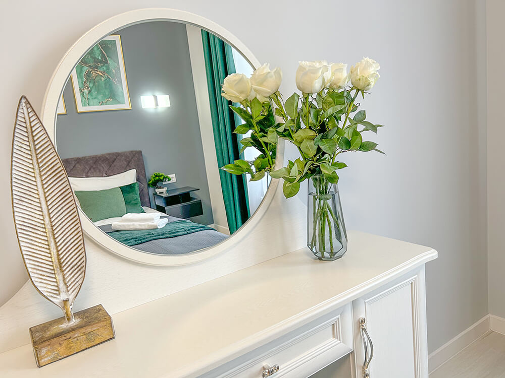 - Мебель: гардеробная, диван, зеркало, комод, кровать двуспальная, прикроватные тумбочки, стол, столик журнальный, столик туалетный, стулья, тумба, шкаф
